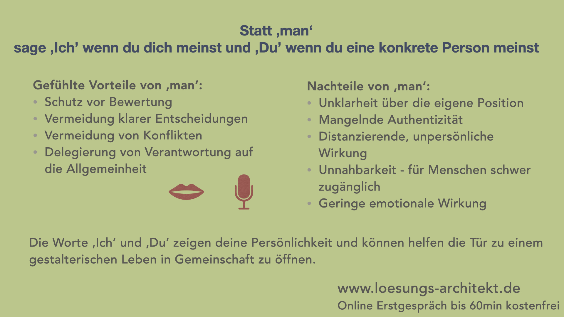 Du verwendest gerne das Wort 'man' auch wenn du von dir selbst 😀 sprichst oder mit einer konkreten Person ? Eine persönliche Formulierung ist klarer und zeigt dich als einzigartiger Mensch.